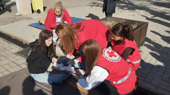 Екипата обучена по прва помош изведе демонстрација на укажување помош кај две повреди – изгореница на рака и реанимација, при што беше прикажана и психолошка прва помош за смирување и поддршка на повредените лица.